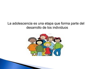 El documento describe la adolescencia como un período de transición entre la infancia y la edad adulta que implica cambios biológicos, cognitivos y socioemocionales. Explica que la formación de la identidad es fundamental durante este período según la teoría de Erik Erikson. Erikson propuso que los adolescentes deben resolver la crisis de identidad vs confusión de roles al explorar y comprometerse con una identidad única.