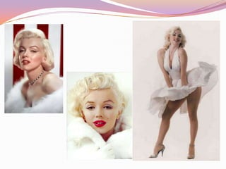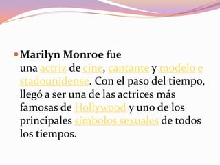 Marilyn Monroe fue una actriz y modelo estadounidense que se convirtió en uno de los mayores símbolos sexuales de todos los tiempos. Comenzó su carrera como modelo y tuvo papeles destacados en películas en la década de 1940 y 1950. Alcanzó fama mundial tras protagonizar los musicales Los caballeros las prefieren rubias y aparecer en la portada de Playboy. Monroe murió en 1962 a los 36 años debido a una sobredosis de barbitúricos en circunstancias nunca esclarecidas.