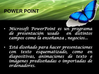 Microsoft PowerPoint es un programa de presentaciones utilizado comúnmente en la enseñanza y los negocios. Permite crear diapositivas con texto, imágenes y animaciones para presentaciones. Ofrece opciones como diseños, fuentes, plantillas, animaciones, transiciones y sonidos. Para crear una presentación en PowerPoint, se abre un nuevo archivo y se agregan diapositivas con objetos, texto y elementos multimedia. Es importante crear presentaciones claras con pocas diapositivas, fuentes legibles y elementos visuales que respalden el mensaje.
