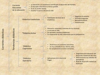 Este documento resume varias corrientes didácticas de la educación. Incluye la corriente naturalista que promueve el desarrollo del estudiante con la menor intervención posible del educador, enseñando lo útil para la vida. También describe tendencias como la didáctica conductista, cognitivista, operatoria y marxista, así como corrientes tradicionales, tecnológicas y críticas.