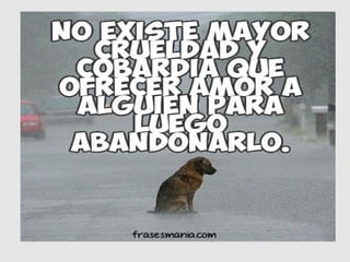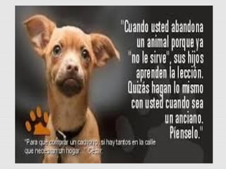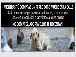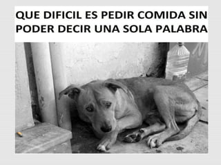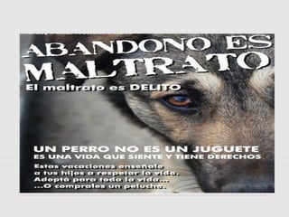 Este documento trata sobre la problemática del abandono animal en Venezuela y las acciones que se pueden tomar para ayudar a los animales en situación de calle. Describe una actividad realizada con vecinos sobre la importancia de alimentar y cuidar a los animales abandonados y evitar su maltrato. Finalmente, explica las causas más comunes del abandono animal y recomienda acciones como la adopción, esterilización, donaciones y voluntariado para ayudar a los animales.