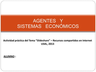 El documento describe los diferentes agentes económicos y sistemas económicos. Los agentes económicos son familias, empresas y el sector público. Estos agentes interactúan en los mercados de bienes y servicios y de factores de producción. En un sistema de planificación centralizada como Cuba, el estado controla la producción y asignación de recursos, lo que ha llevado a la pobreza y falta de libertades.