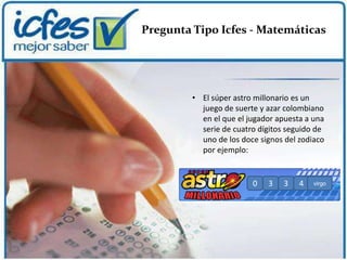 El documento describe el juego de azar "El súper astro millonario" en Colombia, en el que los jugadores eligen cuatro dígitos seguidos de un signo zodiacal. Explica que hay tres formas de ganar: acertando los cuatro dígitos y el signo (pleno), los tres últimos dígitos y el signo (tres cifras), o los dos últimos dígitos y el signo (dos cifras). Luego, presenta una pregunta del ICFES sobre el número de boletas posibles con 3 en la primera casilla, 5 en la