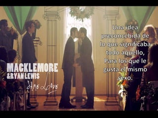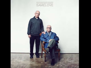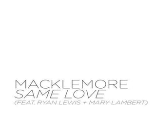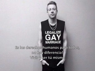 El documento se centra en la canción 'Same Love' de Macklemore y Ryan Lewis, que aborda la temática de los derechos humanos y la aceptación de la diversidad. Publicada como parte del álbum 'The Heist' en 2012, la canción enfatiza la importancia de ser uno mismo sin importar la orientación sexual. Se destaca el mensaje de igualdad y respeto para todos los individuos.