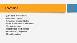 El documento introduce conceptos clave de probabilidad, incluyendo eventos aleatorios, espacio muestral y tasas de probabilidad. Se analizan operaciones con sucesos como la unión e intersección, así como distintos tipos de sucesos y probabilidades condicionadas. También se presenta el famoso 'problema del cumpleaños', que demuestra que es probable que al menos dos personas compartan un cumpleaños en grupos de tamaño relativamente pequeño.