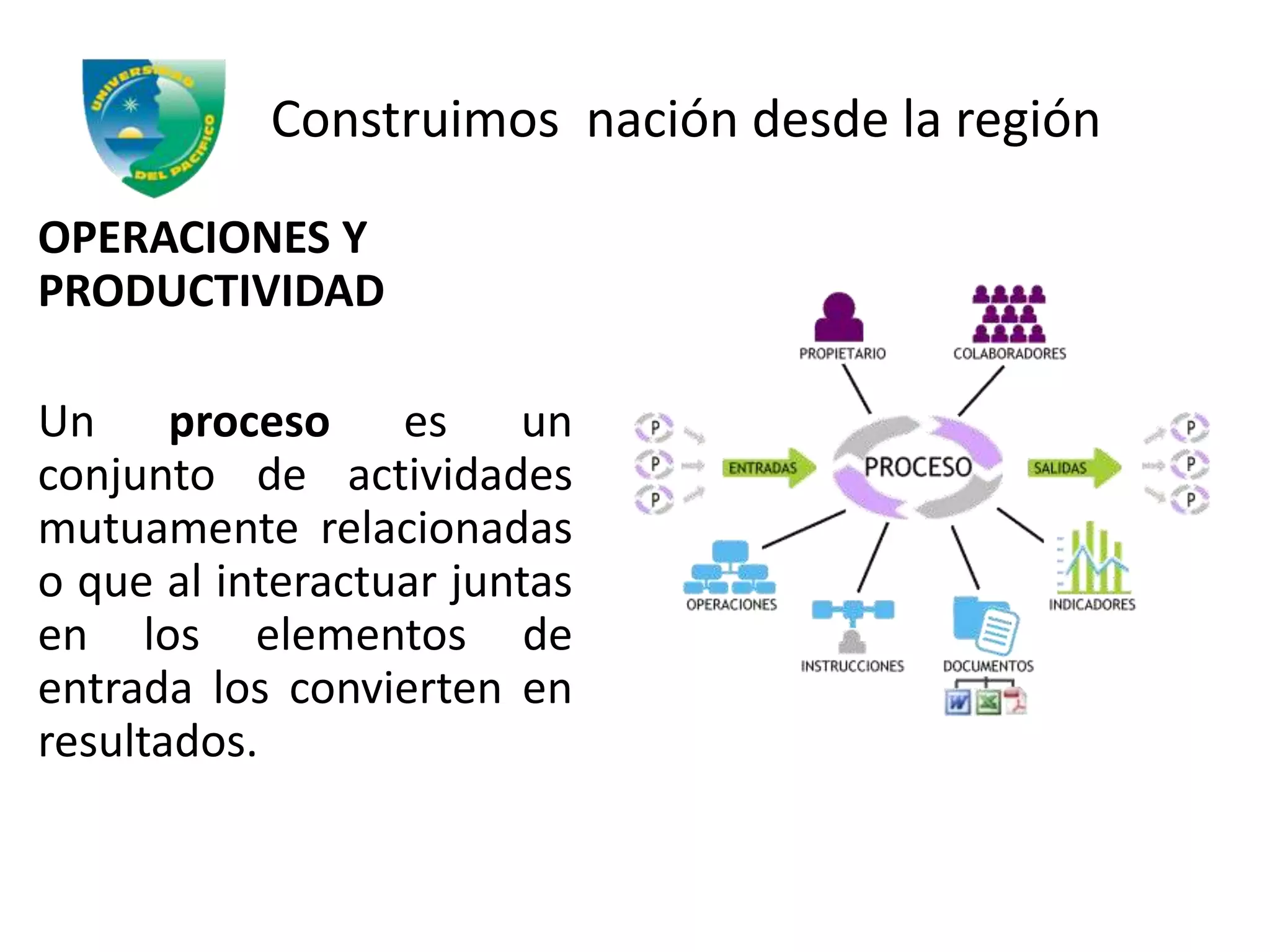 El documento describe los diferentes tipos de procesos, incluyendo procesos productivos que transforman materiales en bienes a través de operaciones planificadas, procesos de servicios orientados al cliente para lograr objetivos organizacionales, e identificación de procesos por proyecto, tareas, lotes, masa o de forma continua.