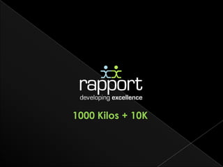 1000 kilos + 10k es un programa de entrenamiento físico y mental que busca mejorar la calidad de vida de las personas a través de valores y la reducción de peso y talla en un ambiente de cooperación. Durante cuatro meses, los participantes trabajan en equipo para alcanzar metas de salud, desarrollar hábitos saludables y mejorar su desempeño laboral y personal. El programa es dirigido por Ricardo Sala Núñez, un experto en entrenamiento mental y físico, y ha demostrado tener un impacto positivo en la vida de cientos de personas.