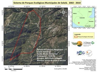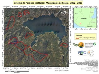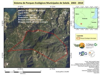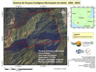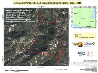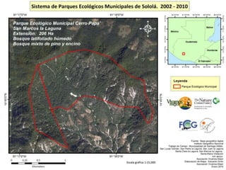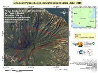El documento detalla un programa de conservación en varios parques regionales del departamento de Sololá, enfocado en la protección de fuentes de agua, flora, fauna y promoción del ecoturismo. Cada parque tiene objetivos específicos, como la educación ambiental en San Lucas Tolimán y la conservación del pavo de cacho en San Pedro Chuanimajuyú. La iniciativa busca también fomentar el desarrollo sostenible mediante prácticas ecoturísticas.