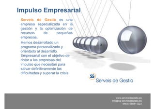 Impulso Empresarial es una empresa dedicada a la gestión y optimización de recursos para pequeñas empresas, ofreciendo un programa personalizado para superar crisis. Este programa abarca tres etapas: diagnóstico, desarrollo e implementación, combinando disciplinas como coaching y consultoría en finanzas, marketing y recursos humanos. El enfoque se centra en identificar la situación actual, planificar el futuro y acompañar a las empresas en el proceso de cambio.
