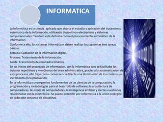 La informática es la ciencia que estudia el tratamiento automático de la información utilizando dispositivos electrónicos. Los sistemas informáticos realizan tres tareas básicas: entrada, proceso y salida de información. Las Tecnologías de la Información y Comunicación (TIC) amplían las capacidades humanas y posibilidades de desarrollo social. La Web 2.0 representa la evolución de aplicaciones tradicionales a aplicaciones enfocadas en el usuario, que generan colaboración y reemplazan aplicaciones de escritorio.