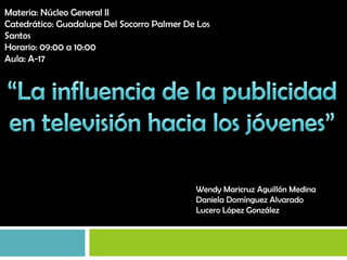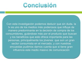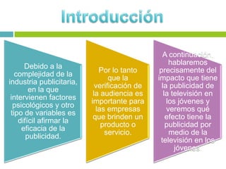 Este documento presenta un resumen de un proyecto de investigación sobre la influencia de la publicidad televisiva en los jóvenes. El proyecto se llevará a cabo en San Luis Potosí de enero a mayo de 2013 e investigará cómo la publicidad televisiva puede influir en los deseos y necesidades de los jóvenes espectadores para que adquieran los productos y servicios anunciados. Se aplicarán encuestas y entrevistas a 160 estudiantes para determinar el impacto de la publicidad televisiva en esta población.
