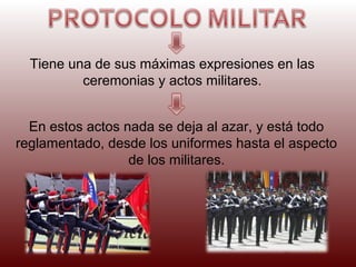 Las ceremonias militares involucran unidades militares uniformadas que se forman de acuerdo a reglas estrictas. Participan con diferentes uniformes, condecoraciones, guiones, armas, música e himnos, dependiendo del evento y la fuerza a la que pertenecen.