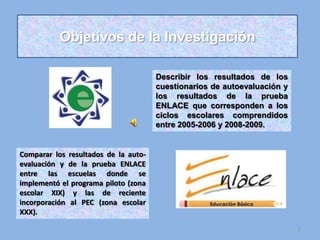 Este documento propone evaluar el Programa Escuelas de Calidad en México mediante el análisis de cuestionarios de autoevaluación y resultados de pruebas aplicadas entre 2005-2009 en escuelas piloto y recién incorporadas al programa. El objetivo es describir los resultados educativos y compararlos entre escuelas para determinar la efectividad del programa. El documento revisa el marco teórico de escuelas efectivas y describe el diseño propuesto para la evaluación.