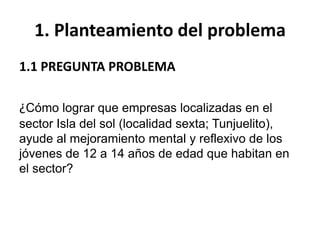 Este documento presenta un proyecto para reducir los altos índices de drogadicción y trabajo infantil entre los jóvenes de 12 a 14 años en el barrio Isla del Sol mediante el apoyo de empresas locales. El proyecto busca ofrecer herramientas basadas en el apoyo de las decisiones de los jóvenes y demostrarles que pueden mejorar su futuro con la ayuda de otros. Se titula "Financiando Mejores Futuros" porque busca la financiación de empresas para ayudar a los niños y jóvenes a lograr