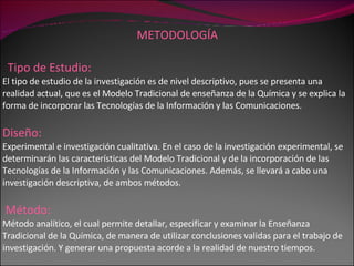 Este documento describe la metodología de una investigación sobre la enseñanza tradicional de la química y la incorporación de tecnologías de la información y comunicación. El estudio es descriptivo y experimental, analizando ambos métodos de enseñanza. Se llevó a cabo con estudiantes de 17 a 18 años en un instituto de Santiago, utilizando herramientas tecnológicas como PowerPoint, Photo Editor y Word para enseñar reacciones de óxido-reducción. Los estudiantes fueron evaluados a través de pruebas para
