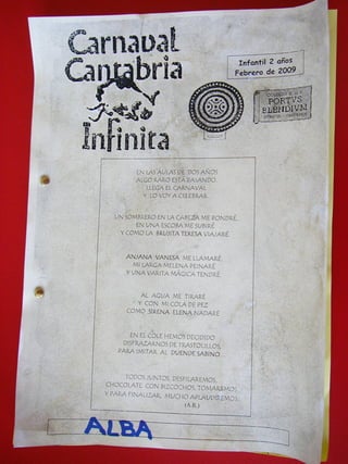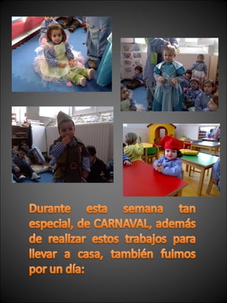 Los niños crearon disfraces para una fiesta de Carnaval usando materiales de desecho como papel, plastilina, espaguetis y gomets. Decoraron accesorios como varitas mágicas, escobas y plumas para personajes como brujas, piratas e indios. Se disfrazaron y maquillaron para la fiesta, donde cantaron canciones y compartieron chocolate y bizcochos con sus familias.