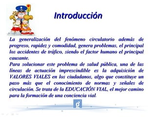 El documento habla sobre la importancia de la educación vial para formar ciudadanos conscientes y responsables en el tráfico. Explica que la educación vial debe comenzar desde la infancia y continuar a lo largo de las etapas de primaria y secundaria, enseñando normas de seguridad vial apropiadas para cada edad. Los objetivos generales incluyen crear actitudes de prevención, interpretar situaciones de tráfico con prudencia, conocer las normas como peatones y fomentar el respeto a las leyes y agentes