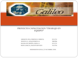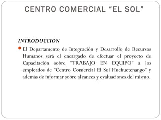 El documento presenta un proyecto de capacitación sobre trabajo en equipo dirigido a los empleados de un centro comercial en Huehuetenango, Guatemala. El proyecto tiene como objetivo capacitar al personal sobre trabajo en equipo de manera práctica y autodidacta. La capacitación se llevará a cabo en un hotel durante un día y abarcará temas como relaciones interpersonales y trabajo en equipo. Se evaluarán los resultados durante los 30 días posteriores.