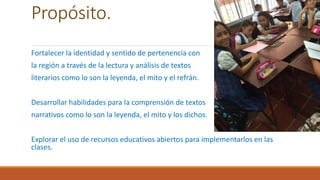El proyecto educativo tiene como objetivo fortalecer la identidad regional mediante la lectura y análisis de textos literarios, como mitos y refranes, desarrollando así habilidades de comprensión lectora. Se utilizan diversos recursos educativos digitales y se llevan a cabo metodologías interactivas para involucrar a los estudiantes en el aprendizaje. Se identificaron fortalezas en el gusto por la tradición oral y la motivación en el uso de TIC, aunque se sugiere una mayor ejercitación en preguntas inferenciales y la dotación de más recursos audiovisuales.