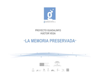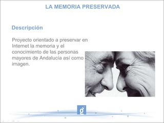 Este documento describe un proyecto llamado "La Memoria Preservada" cuyo objetivo es preservar la memoria y el conocimiento de las personas mayores de Andalucía a través de entrevistas grabadas en video que se publicarán en Internet. El proyecto involucra a tres centros Guadalinfo y busca dinamizar a las personas de la tercera edad, formar usuarios para promover el uso de la tecnología, aumentar la autoestima y preservar la tradición oral a través de las TIC.