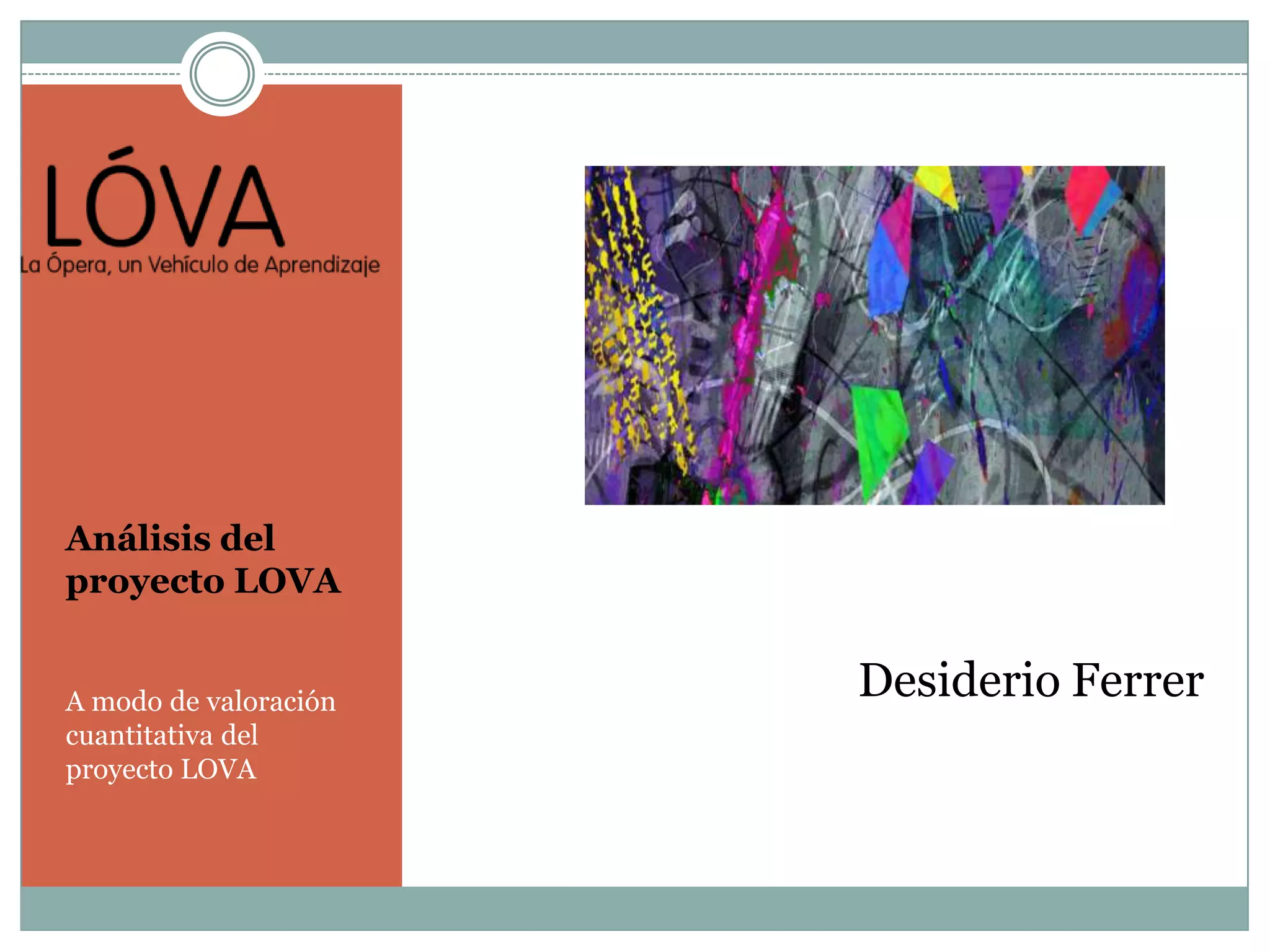 Este documento resume el proyecto LOVA, el cual consiste en que estudiantes crean una ópera desde cero incluyendo la música, libreto, coreografía y vestuario. LOVA permite que los estudiantes programen sus propios aprendizajes y resuelvan problemas de forma independiente. El proyecto ha recibido apoyo institucional de varias organizaciones.