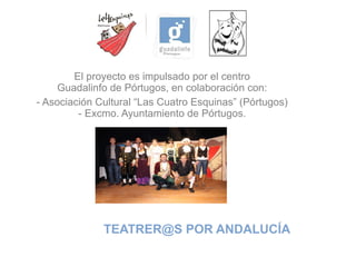 El documento describe el proyecto "Teatrer@s por Andalucía" impulsado por el centro Guadalinfo de Pórtugos y la Asociación Cultural "Las Cuatro Esquinas" para promover el teatro en municipios pequeños a través de las nuevas tecnologías. El proyecto busca aumentar la oferta cultural, enriquecer el interés por el teatro y reactivar la actividad social en zonas rurales compartiendo información sobre obras, eventos y subvenciones relacionadas con el arte escénico.