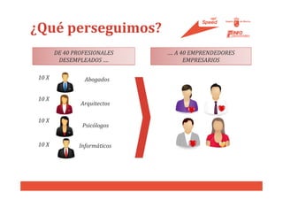 El programa de aceleración de creación de empresas de la Región de Murcia busca transformar a 40 profesionales desempleados en emprendedores mediante formación y mentoría. Consiste en una serie de fases que incluyen identificación de participantes, píldoras formativas y competiciones de planes de negocio, enfocándose en diversas áreas como creatividad, marketing y comunicación. Se espera que, al menos, se creen 4 nuevas empresas como resultado de este proceso formativo.