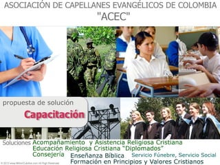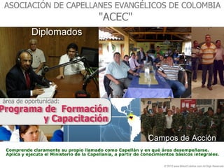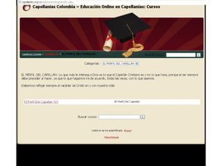 Este documento describe un diplomado en capellanía que ofrece capacitación en TICs, desarrollo de competencias digitales, y acceso a internet para video tutoriales, evaluaciones en línea y prácticas virtuales a través de módulos básicos de enseñanza. El diplomado dura 160 horas y está dirigido a hombres y mujeres interesados en acompañar a otros en diferentes procesos de sus vidas a través de la capellanía en la salud, educación, militar, cárcel y funeraria.