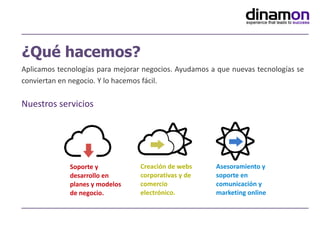 Dinamon es una empresa que ofrece servicios de consultoría, desarrollo y soporte tecnológico para ayudar a otras empresas a mejorar sus negocios mediante el uso de nuevas tecnologías. Algunos de los servicios que ofrece Dinamon incluyen el desarrollo de planes de negocio, páginas web corporativas y de comercio electrónico, y asesoramiento en marketing y comunicaciones en línea.