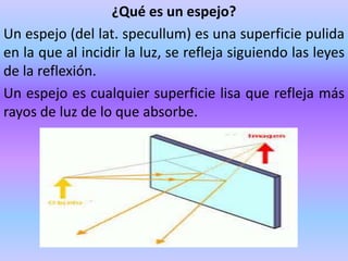 Un espejo es una superficie pulida que refleja la luz siguiendo las leyes de la reflexión. Los espejos se clasifican en planos, cóncavos, convexos y curvos. Un espejo plano refleja la luz con una imagen virtual, simétrica y del mismo tamaño que el objeto. Los espejos esféricos tienen un centro de curvatura, radio de curvatura y foco donde convergen los rayos incidentes paralelamente. Las lentes convergentes hacen converger los rayos mientras que las divergentes los hac