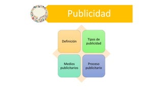 La publicidad es una forma de comunicación que intenta incrementar el consumo de un producto o servicio. Existen diferentes tipos de publicidad como la publicidad dirigida a consumidores, industrias o comerciantes. También hay publicidad genérica o específica, de largo o corto plazo, de marca, institucional o de producto. Los principales medios publicitarios son la televisión, radio, internet y prensa. El proceso publicitario implica realizar estudios de mercado, definir una estrategia y diseñar una campaña con objetivos clar