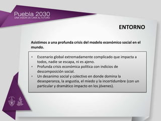El documento describe el contexto de crisis global y en México y Puebla. Menciona la crisis de representatividad, valores y resultados. Propone una agenda económica, social y de competitividad para Puebla, con énfasis en educación, innovación, sector primario y desarrollo de infraestructura. También habla de la necesidad de un nuevo liderazgo solidario, estratégico y trascendente, y propone crear un diagnóstico del estado y convocar a líderes para debatir proyectos de desarrollo.