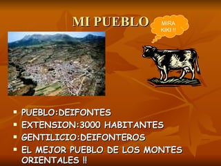 El documento proporciona información sobre el pueblo de Deifontes, España. Incluye detalles sobre sus principales atracciones como la atalaya y el palacio, el nacimiento de agua y sus fiestas patronales del 15 de agosto. También describe la gastronomía local, opciones de turismo rural, iglesia, ayuntamientos y la cooperativa ganadora de premios por su aceite de oliva.