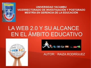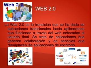 La Web 2.0 permite aplicaciones colaborativas que funcionan a través del navegador en lugar de aplicaciones de escritorio. Tiene ventajas como software gratuito, acceso desde cualquier lugar y dispositivo, y actualizaciones automáticas, pero también riesgos como la privacidad de datos y cambios en las condiciones del servicio. En educación, hay recursos Web 2.0 como blogs, wikis y redes sociales que permiten publicar, compartir, relacionarse y cooperar si cumplen con criterios como interactividad y colaboración.