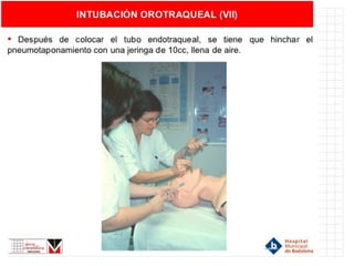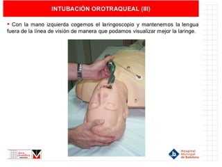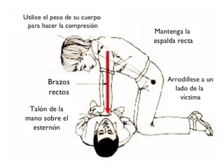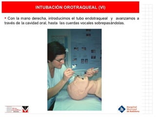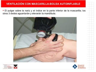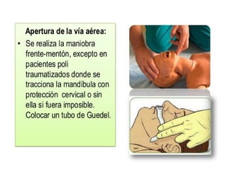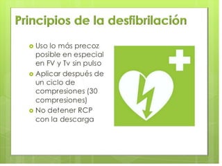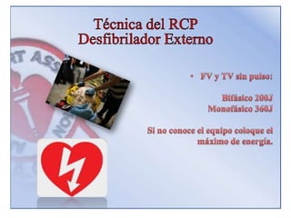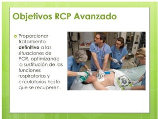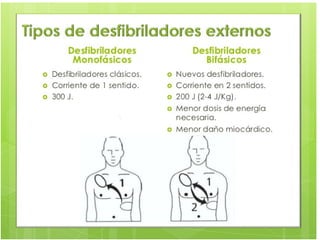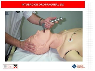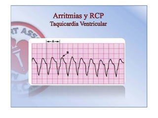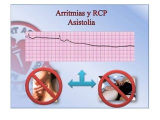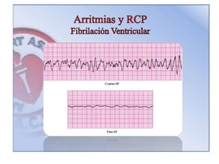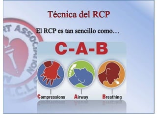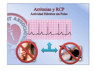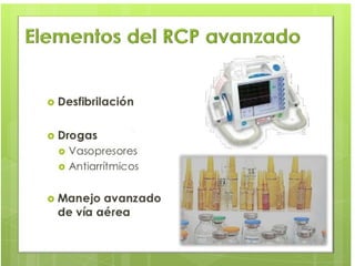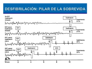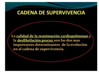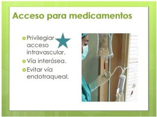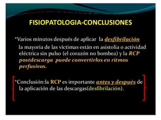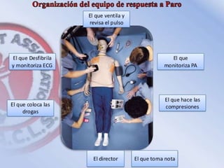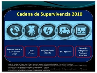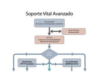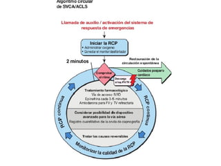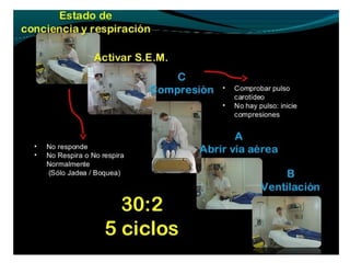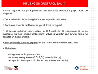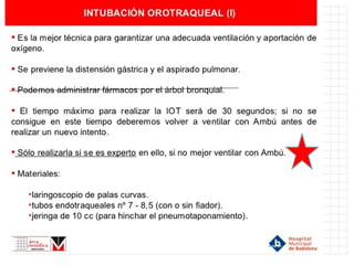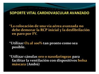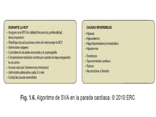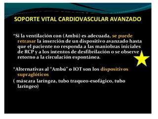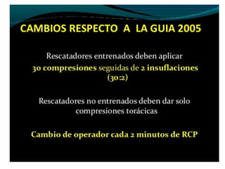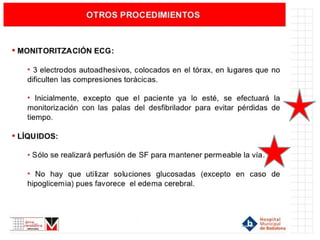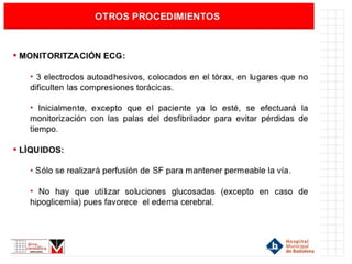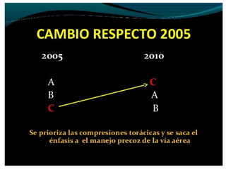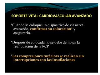 Este documento destaca la importancia de realizar compresiones torácicas de alta calidad de forma continuada durante cualquier intervención de parada cardiorrespiratoria en adultos, según las guías de 2010. Incluye una lista de equipamiento necesario como aspirador, desfibrilador y bala de oxígeno, así como instrucciones sobre la aspiración de secreciones, conexión de ambú y revisión del pulso solo ante ritmo organizado.