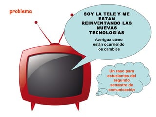Este documento presenta una práctica para estudiantes de comunicación sobre el uso de recursos educativos abiertos para investigar los cambios en la televisión debido a las nuevas tecnologías. Propone definir un problema, objetivo estrategia de búsqueda y sitios sugeridos para encontrar información sobre temas como la televisión e internet, televisión y nuevas tecnologías, y formas de consumo emergentes. Los estudiantes deberán encontrar al menos 5 recursos educativos abiertos, 15 fuentes directas, y producir un ensayo