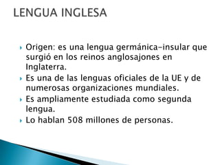 El documento trata sobre el área de lengua extranjera (inglés). Explica que el inglés surgió en Inglaterra, es una lengua oficial de la UE y la hablan más de 500 millones de personas. Aprender un idioma requiere desarrollar destrezas lingüísticas como escuchar, hablar, leer y escribir. El objetivo es desarrollar la competencia comunicativa a través de actividades lúdicas y el uso de las TIC.