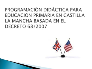 El documento trata sobre el área de lengua extranjera (inglés). Explica que el inglés surgió en Inglaterra, es una lengua oficial de la UE y la hablan más de 500 millones de personas. Aprender un idioma requiere desarrollar destrezas lingüísticas como escuchar, hablar, leer y escribir. El objetivo es desarrollar la competencia comunicativa a través de actividades lúdicas y el uso de las TIC.
