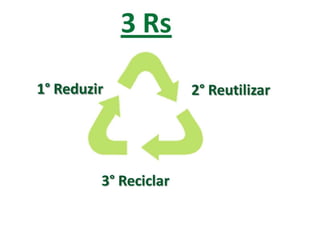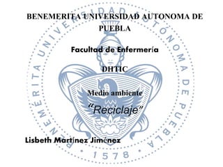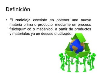 El documento define el reciclaje como obtener nuevas materias primas a partir de productos usados mediante procesos físicos o químicos. Explica que el reciclaje implica reducir, reutilizar y reciclar los residuos, y surge para hacer frente al agotamiento de recursos naturales. Finalmente, concluye que el reciclaje puede contribuir a un cambio hacia una vida más sostenible si desarrollamos conciencia ambiental y cambiamos nuestros hábitos de consumo.