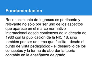 El documento discute el reconocimiento de ingresos en la industria de software y TIC de acuerdo a las normas contables internacionales. Explica conceptos como contratos de múltiples elementos, software como servicio, y casos prácticos de reconocimiento de ingresos en diferentes modelos de negocios de software.