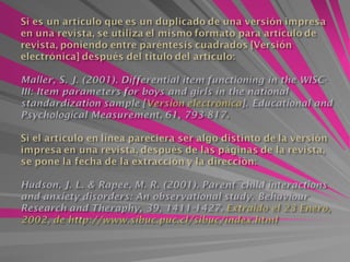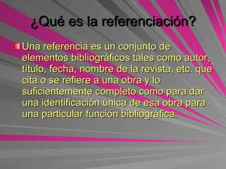 Este documento proporciona información sobre la referenciación y el estilo APA. Explica que una referencia bibliográfica debe incluir elementos como el autor, título, fecha y otros detalles para identificar de manera única la fuente. También describe los requisitos para citar fuentes en el texto y listar las referencias, como que deben estar en orden alfabético. Finalmente, detalla los formatos específicos para citar diferentes tipos de fuentes como libros, artículos, documentos y más.