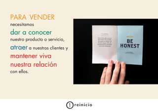 Este documento presenta varias estrategias y herramientas de comunicación para dar a conocer un producto o servicio, atraer clientes y mantener una relación con ellos, como redes sociales, prensa, textos, vídeo, folletos, anuncios, noticias, blogs, logotipos, presentaciones, ferias y más. También enfatiza la importancia de diferenciarse de la competencia a través de la interacción, creatividad y adaptación al entorno actual con menor presupuesto.