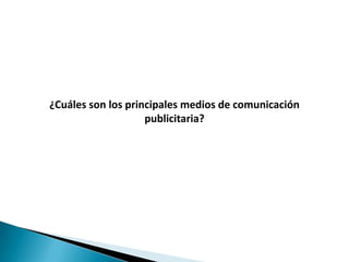 El documento describe los principales medios de comunicación publicitaria como el contexto impreso (periódicos y revistas), la publicidad radiofónica, la televisión y las técnicas para crear comerciales efectivos para cada medio. Explica que cada medio tiene sus propias características y estrategias de producción para crear anuncios que transmitan el mensaje deseado.