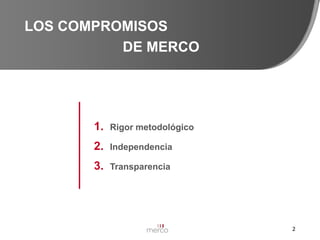 El documento presenta los resultados del estudio Merco Perú 2013 sobre la reputación corporativa de las empresas peruanas. Algunos de los hallazgos clave son: 1) El Banco de Crédito del Perú vuelve a liderar el ranking general de reputación; 2) Se consolidan los liderazgos sectoriales con pocos cambios en el primer puesto de cada sector; 3) Ocho compañías suben más de 20 puestos en el ranking.