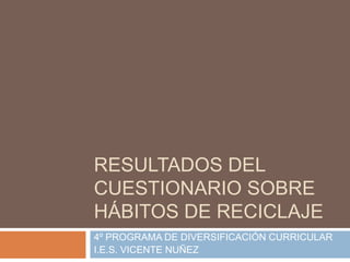 El cuestionario sobre hábitos de reciclaje realizado a los alumnos de 4o del programa de diversificación curricular revela que la mayoría de las familias son conscientes de la importancia del reciclaje, aunque aún hay un porcentaje significativo que no practica la separación de residuos. La clase muestra interés en los orígenes de los productos que consumen, pero solo la mitad se preocupa por comprar productos con poco embalaje y la otra mitad no utiliza comercio justo. Además, existe una buena comprensión de los contenedores específicos para los diferentes tipos de residuos, aunque hay errores comunes en su clasificación.