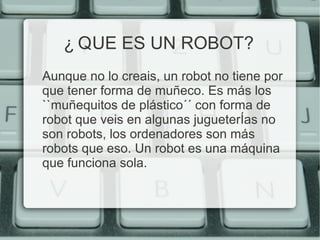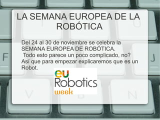 La semana europea de la robótica se celebra del 24 al 30 de noviembre. Un robot es una máquina que funciona sola y sirve para hacer trabajos peligrosos o complicados para humanos. Existen diversos tipos de robots como brazos robóticos, robots gigantes, robots minúsculos, robots humanoides, animales robots, robots exploradores, robots espaciales, robots médicos, robots ecológicos y juguetes robóticos.