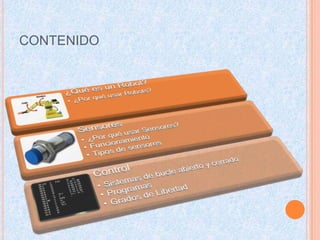 Este documento proporciona una introducción a los robots, incluyendo sus componentes principales, funciones y usos. Explica que un robot es un dispositivo mecánico controlado por una computadora que puede realizar tareas a través de movimientos. Los robots se usan comúnmente en la industria para tareas repetitivas, peligrosas o de fuerza que los humanos no pueden o no quieren hacer. El documento también describe los sensores y sistemas de control de bucle cerrado que permiten a los robots funcionar de manera automatizada.