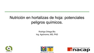 Este documento discute los potenciales peligros químicos en hortalizas de hoja como resultado de la contaminación con nitratos, metales pesados y patógenos. Explica cómo factores como fertilizantes, abonos, aguas de riego y manejo de poscosecha afectan la inocuidad de los productos. También analiza los riesgos para la salud humana asociados con el consumo de nitratos y metales pesados como el plomo y cadmio. Concluye que si bien existen contaminantes químicos derivados de