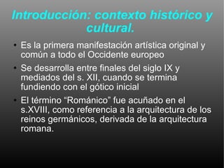 El documento resume las características principales del arte románico en Europa entre los siglos IX y XII. Se desarrolló como la primera manifestación artística común en Occidente después de la caída del Imperio Romano. La arquitectura románica se centró en la construcción de grandes catedrales y basílicas con bóvedas de cañón y contrafuertes. La escultura y la pintura se usaron principalmente para decorar el interior de los templos y transmitir mensajes religiosos.