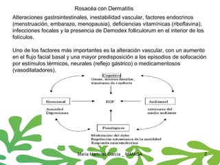 La rosácea con dermatitis es un trastorno inflamatorio crónico de la piel caracterizado por enrojecimiento y vascularidad, con causas aún desconocidas que incluyen predisposiciones genéticas y alteraciones vasculares. Se asocia con migrañas y puede verse agudizada por factores ambientales; su tratamiento incluye fitoinnovaciones y medidas generales como evitar cambios de temperatura y mantener una buena hidratación. Existen productos alternativos y un ungüento a base de cera virgen y extractos vegetales que pueden ayudar en el manejo de la condición.